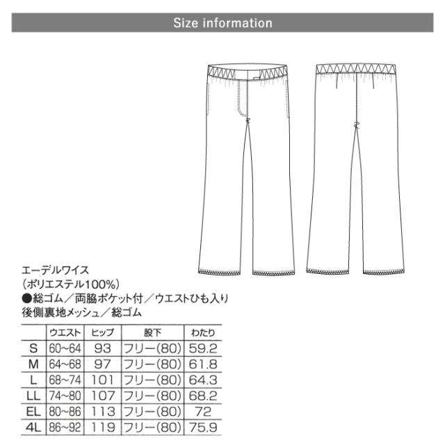 ウエスト部分は総ゴムで履きやすく、様々な白衣やスクラブに合わせられます。