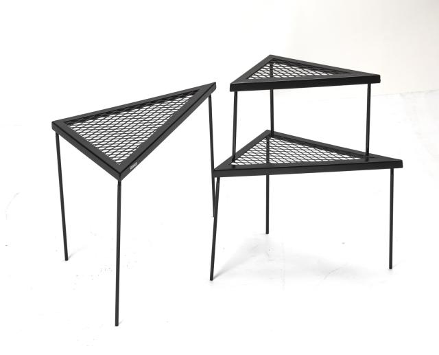 大きさの異なる3つの三角形のテーブル3点と、3段階の高さが変更できる取り外し可能な3サイズの鉄脚3本づつ付属しています。