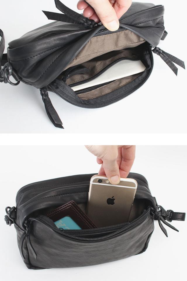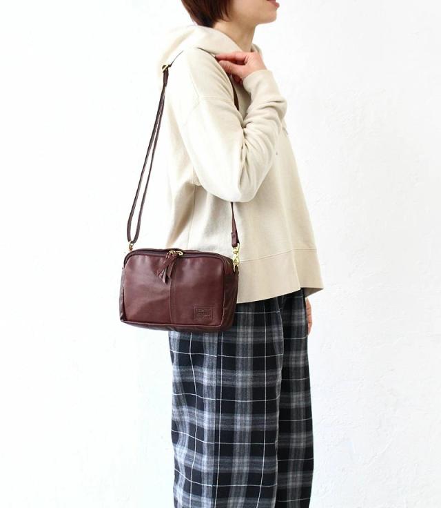 馬革の軽さや柔らかさを最大限に生かせるように金具を少なく、芯材もソフトなタイプを選び、部分的にトリプルステッチを施すことで伸びを防ぐと共にデザインのアクセントにしています。内装の生地は荷物の出し入れの際に手に触れることを意識して手触りのソフトなコットンサテンを用いました。小振りなサイズながらも2ルーム仕様で使い勝手の良いショルダーバッグです。ショルダーストラップは取り外し可能で、バッグインバッグの様な使い方もお楽しみいただけます。また、小物やカードを収納できるポーチを付属しています。