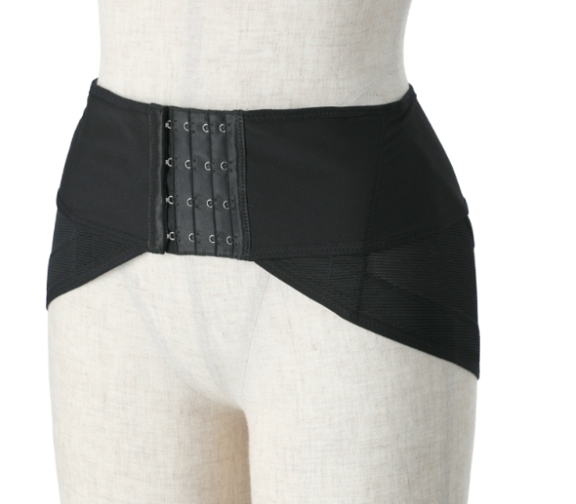 縦横によく伸びる、幅広のパワーネット生地を採用。お腹周りに段階的なフックがあるので圧迫感がなく、ラクに着脱できます。ヒップ部分には通気性を兼ね備えたメッシュ素材を使用。ムレにくく、快適に包み込みます