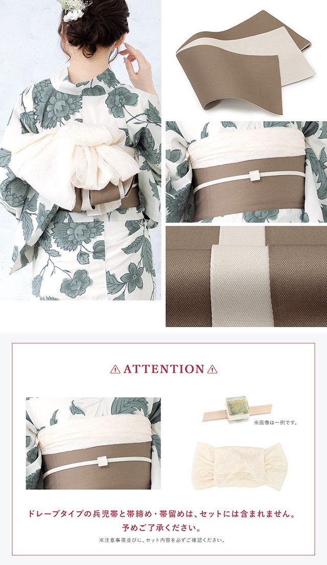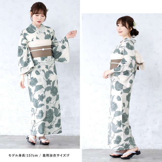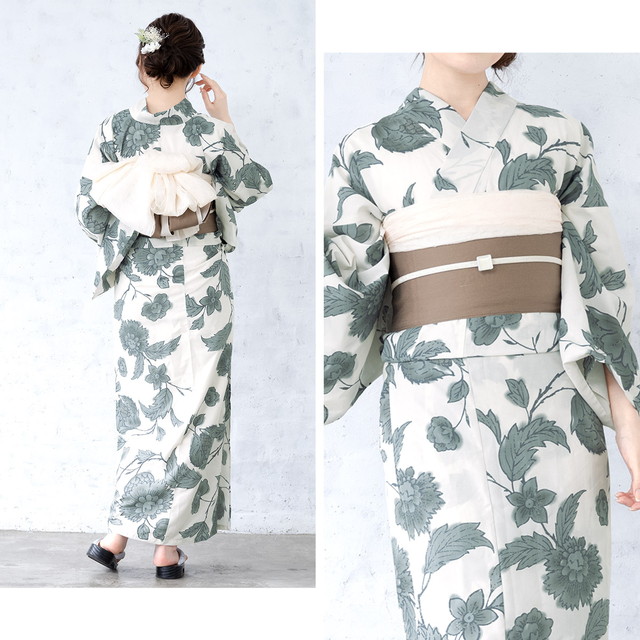 浴衣セット レディース 浴衣セット 半幅帯 大人 3点セット ホワイト 白 グレー 灰色 グレージュ 帯 牡丹 ダリア 花唐草 夏 花火大会 モダン Sサイズ フリーサイズ