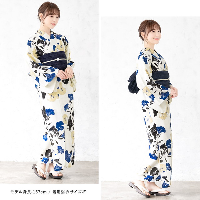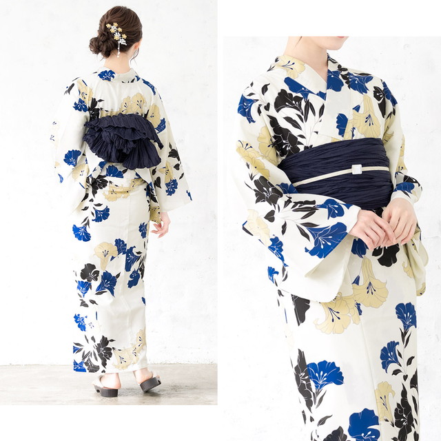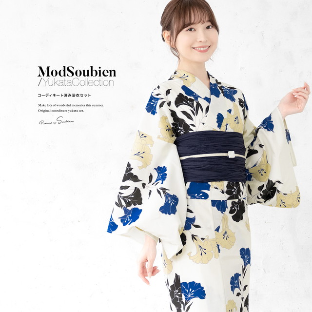 浴衣セット レディース 浴衣セット 兵児帯 大人 3点セット クリーム系 青 黒 紺 帯 百合 ゆり 花 夏 花火大会 モダン Sサイズ フリーサイズ