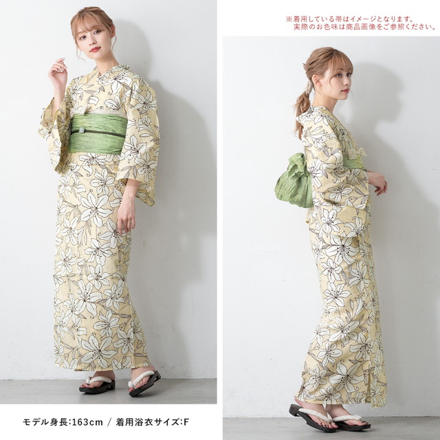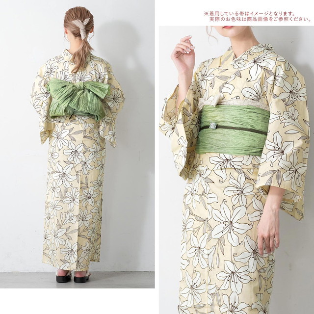 浴衣セット レディース 浴衣セット 兵児帯 大人 3点セット クリーム 薄黄色系 白 緑 帯 百合 ユリ 花 綿 夏 花火大会 モダン Sサイズ フリーサイズ
