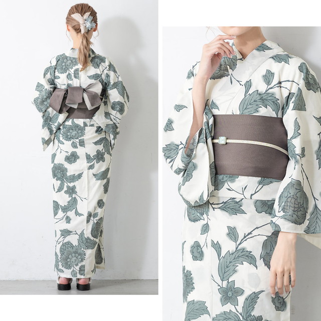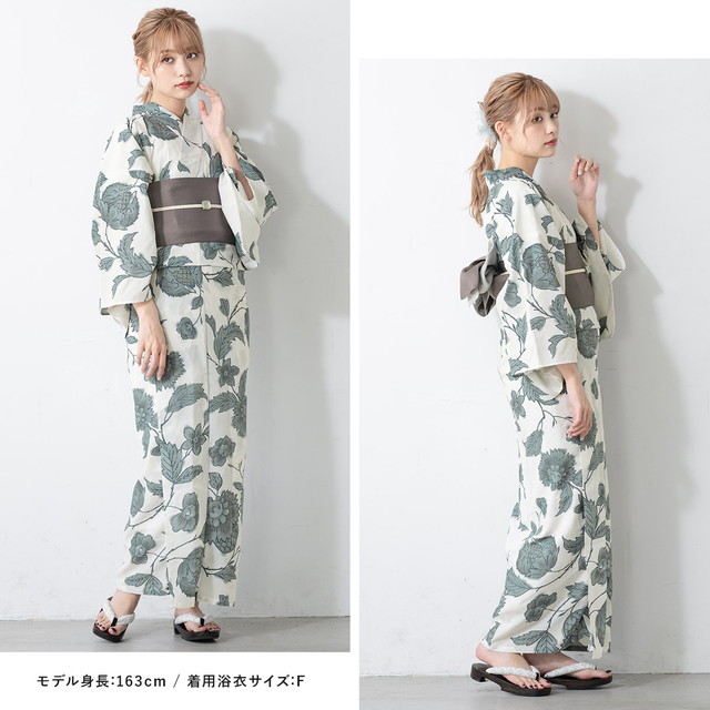 浴衣セット レディース 浴衣セット 半幅帯 大人 3点セット ホワイト 白 グレー 灰色系 帯 牡丹 ダリア 花唐草 夏 花火大会 モダン Sサイズ フリーサイズ