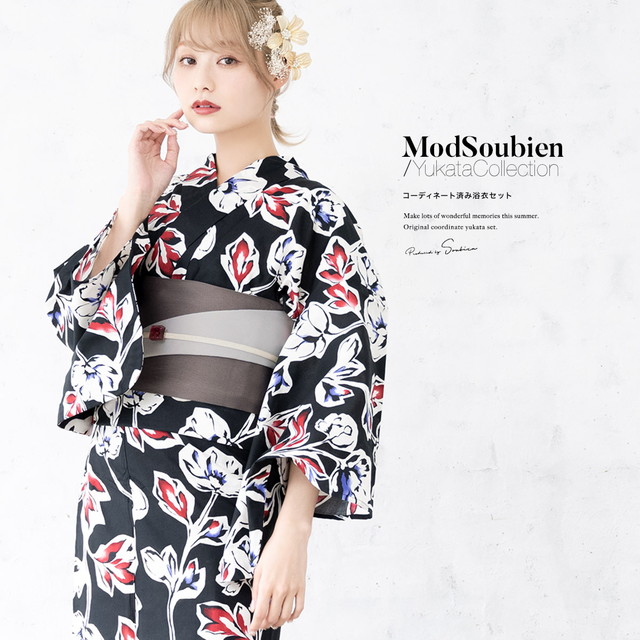 こちらの商品は、浴衣・帯・下駄の3点セットです。セット内容の一部変更や、それに伴う値引きは承っておりません。
