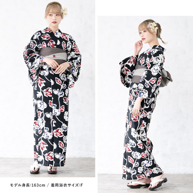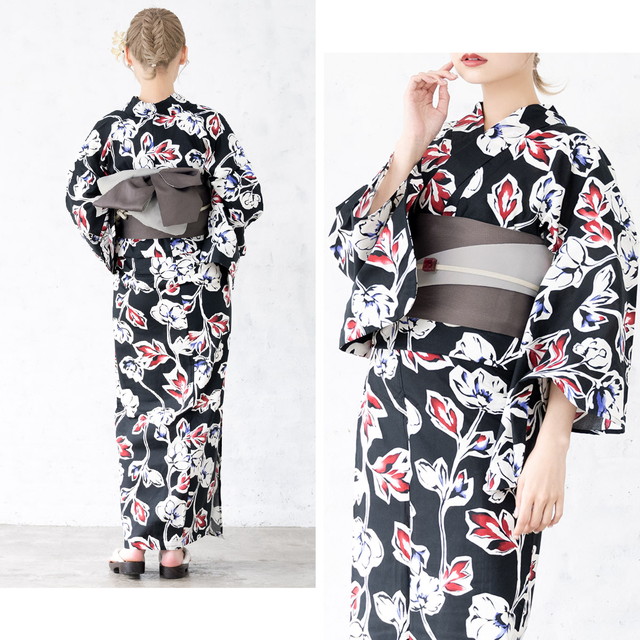 浴衣セット レディース 浴衣セット 半幅帯 大人 3点セット ブラック 黒系 赤 紫 グレー 帯 花 綿 夏 花火大会 モダン Sサイズ フリーサイズ