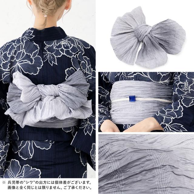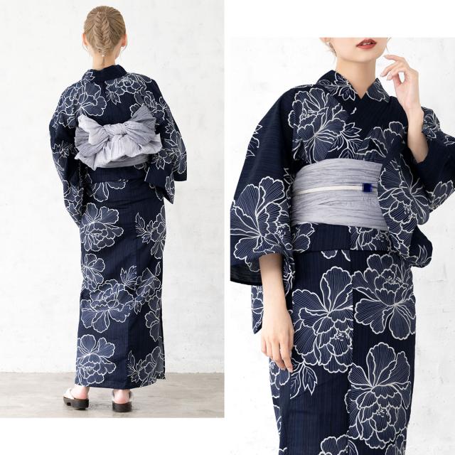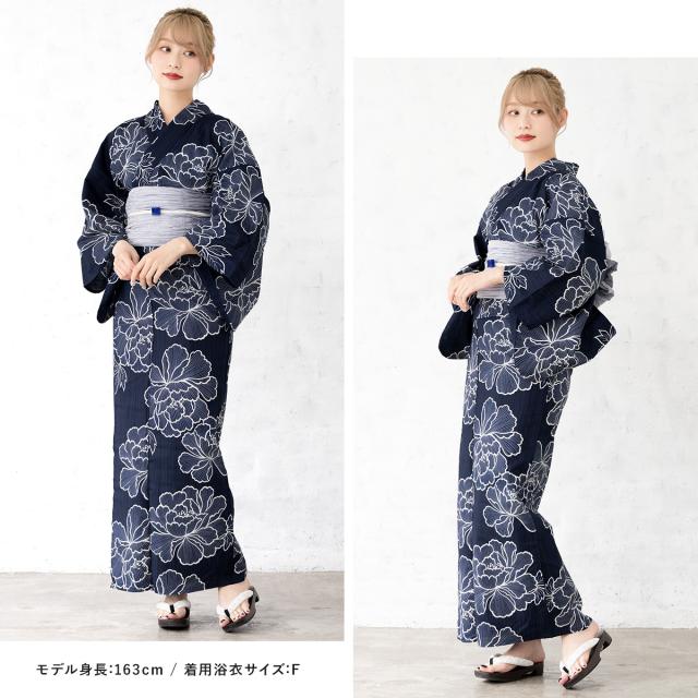 浴衣セット レディース 浴衣セット 兵児帯 大人 3点セット ネイビー 紺系 グレー 帯 雨縞 牡丹 花 夏 花火大会 モダン Sサイズ フリーサイズ