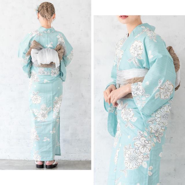 浴衣セット レディース 浴衣セット 兵児帯 大人 3点セット ライトブルー 水色 グレー系 帯 辻が花調 花 綿 夏 花火大会 モダン Sサイズ フリーサイズ