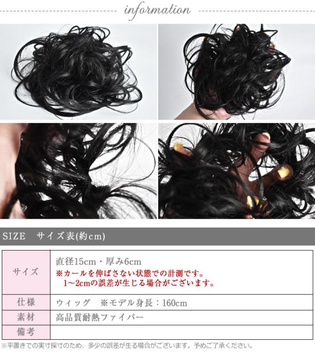 | 商品説明 | 自毛で作ったお団子に、シュシュのようにはめるだけで簡単にボリュームのあるスタイルが完成するウィッグです。伸縮性のあるゴム素材でできているので、ヘアゴム感覚で簡単にサッと使えます♪ゆるめのカールとしっかりカールのミックスタイプなので、しっかりしたボリュームが欲しい時にオススメ!テカリを抑えた自然な髪質の耐熱ファイバーを使用しているので、自毛に馴染みやすいのが特徴です。ドレスアップや着物の時のヘアアレンジにも大活躍してくれるウィッグです。忙しい朝にも一瞬でこなれたヘアスタイルに大変身♪ |