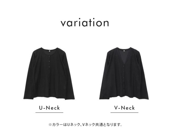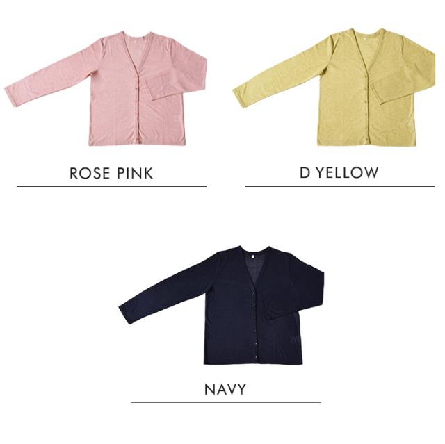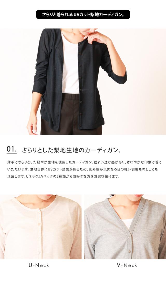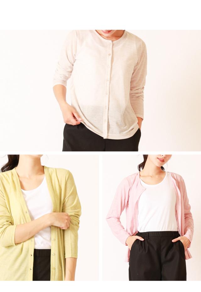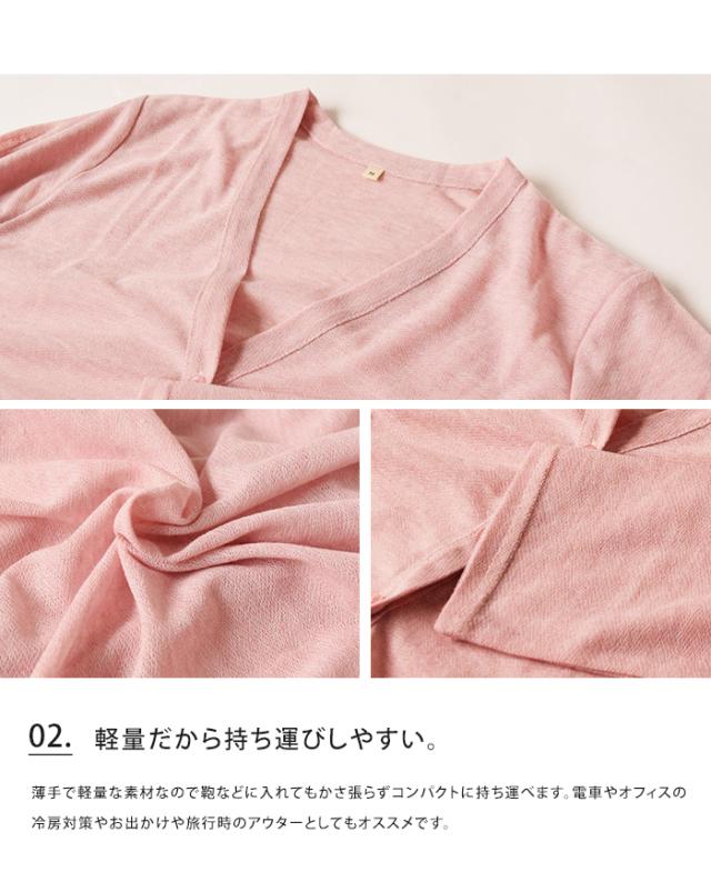 薄手でさらりとした軽やか生地を使用したVネックカーディガン。程よい透け感があり、さわやかな印象で着ていただけます。生地自体にUVカット効果があるため、紫外線が気になる日の軽い羽織ものとしても活躍します。薄手で軽量ななので鞄などに入れてもかさ張らずコンパクトに持ち運べます。電車やオフィスの冷房対策やお出かけや旅行時のアウターとしてもオススメです。