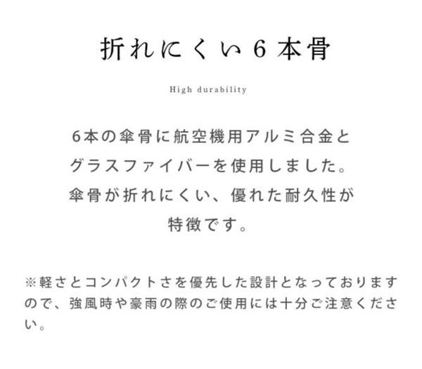 | 素材 | 【素材】高密度のNC布 【親骨】アルミニウム合金製 【傘骨】ガラス繊維&スチール製 |