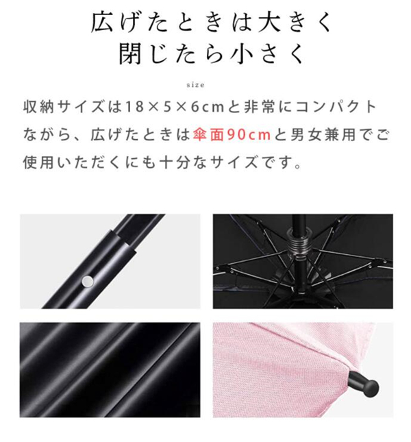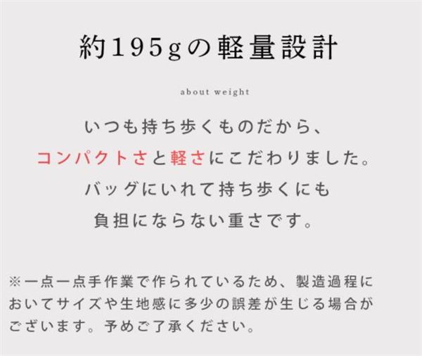 | 商品特徴 | 1、【THE”かわいい”の決定版】レディース向けの軽量な折り畳み傘となっています。”まんまる”なデザインフォルムの持ち手と豊富なカラーバリエーションで女性らしい折り畳み傘となっています。 2、【超撥水性】高密度のNC布と撥水加工なので、普通の折り畳み傘より撥水性があります。折りたたみ傘に超撥水のテフロン加工を施すので傘を閉じた後、軽く振るだけで、水滴が簡単に振り払えます。 3、【収納ポーチ付き】濡れた折り畳み傘の収納ポーチ付きます。訪問先や電車バスに乗る際のわずらわしさが解消されます。 4、【オールOKな晴雨兼用傘】雨の日でも、夏の日差しが強い日でも使える晴雨兼用折りたたみ傘となっています。シンプルでスッキリとしたデザインカラーとなっていますので、春夏秋冬問わずご利用いただけます。雨傘としても日傘としてもおしゃれアイテムとしてご活用ください。 |