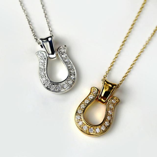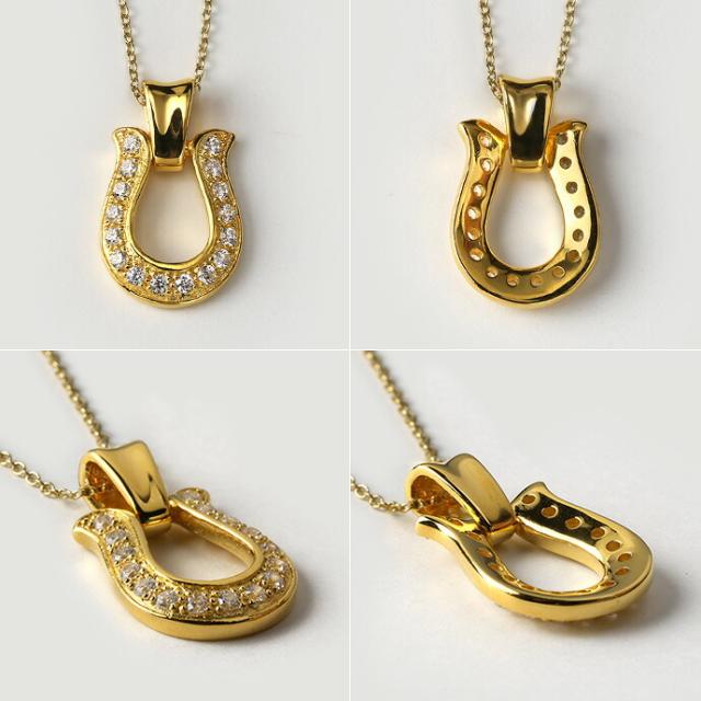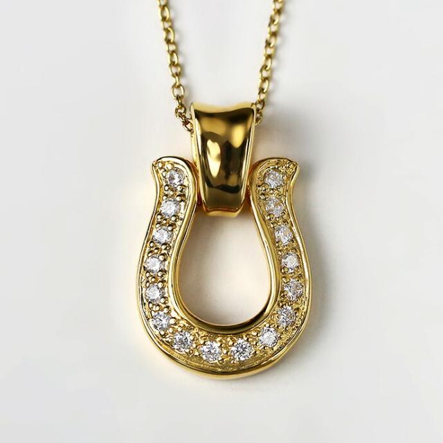 表面にジルコニアがふんだんに埋め込まれたホースシュー(馬蹄)型のペンダント。全体が盛り上がるように湾曲しているので、様々な角度からジルコニアに光が当たり、ラグジュアリーに輝きます。幸運を呼ぶモチーフとして知られるホースシューは、お守り代わりに着けたりギフトとしてもオススメです。