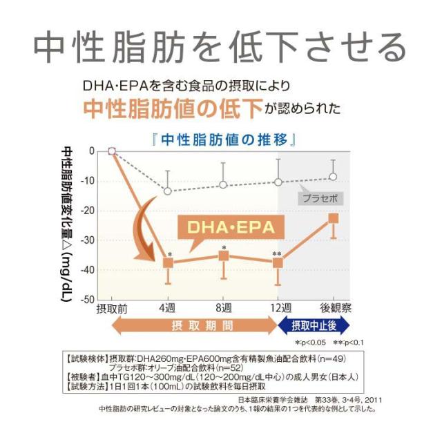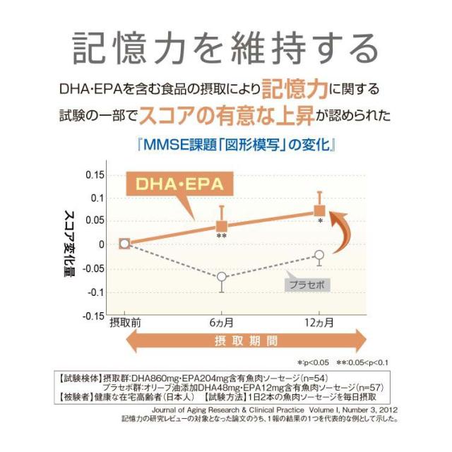 DHA・EPAには、認知機能の一部である記憶力(数・ことば・状況などの情報を記憶し、思い出す力)を維持する機能があることが報告されています。また、DHA・EPAは中性脂肪を低下させる機能があることが報告されています。