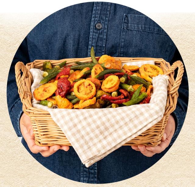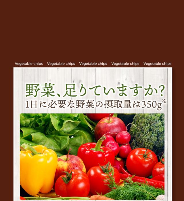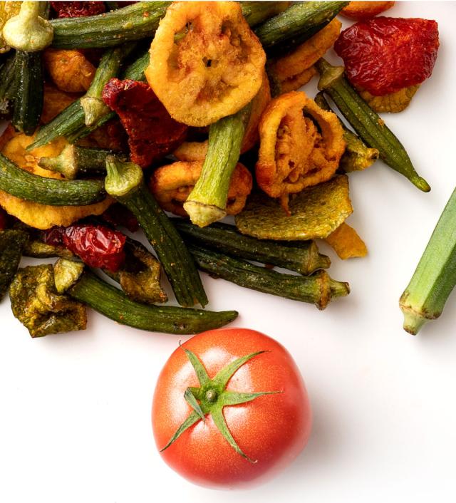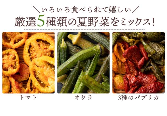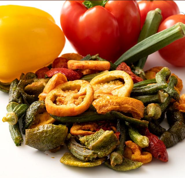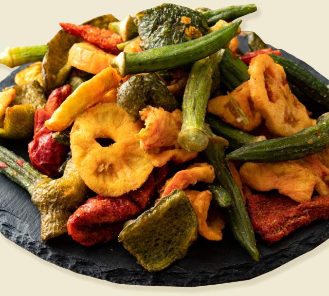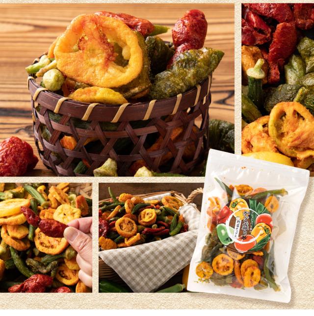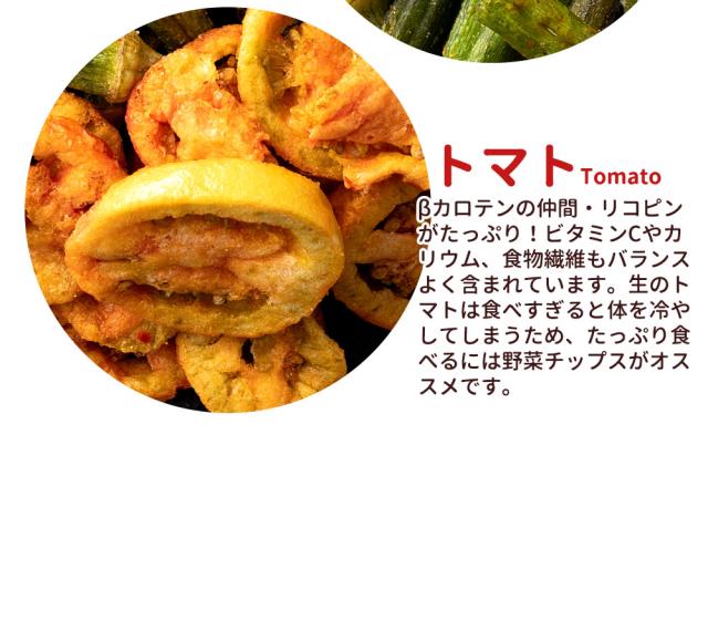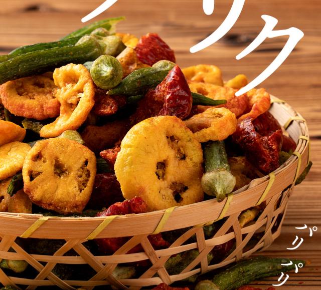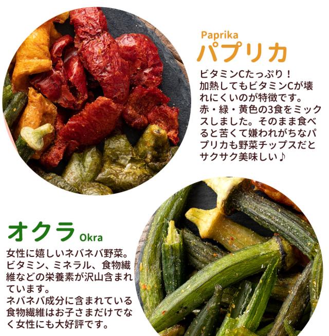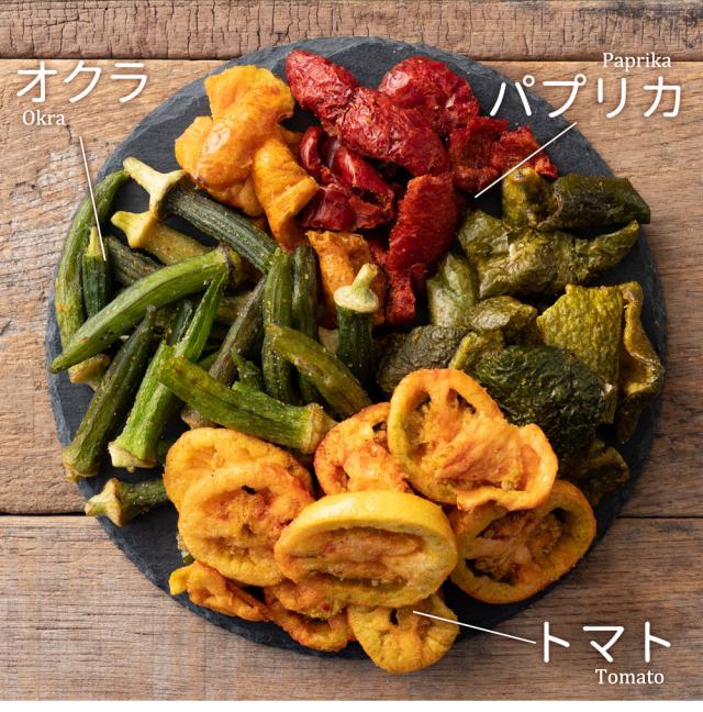 原材料:オクラチップ(オクラ、植物油、麦芽糖、食塩)、ミックスパプリカチップ(緑パプリカ、赤パプリカ、黄パプリカ、植物油、麦芽糖、食塩)、トマトスライスチップ(トマト、植物油、麦芽糖、食塩)