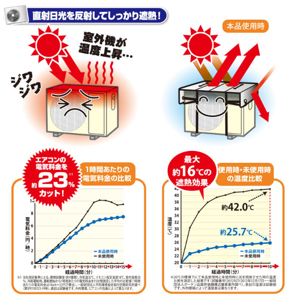 | 商品説明 | 直射日光をカット!太陽熱による負担を軽くする! ・室外機の上に取り付けるだけで直射日光をカット! ・固定ベルト付きで取り付け簡単。室外機の上にのせるだけ! ・直射日光を遮断し、太陽熱による室外機の温度上昇を抑え、冷房運転中の室外機の負担を軽くします。 ・屋外への設置が多い室外機のホコリや汚れもカット。劣化を防ぐことが出来ます。 |