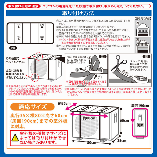 | サイズ | (約)奥行35×横80cm(使用時、ベルト除く) ※奥行35×横80×高さ60cm(周囲190cm)までの室外機に対応 ※室外機の種類やサイズによっては取り付けができない場合があります。 |