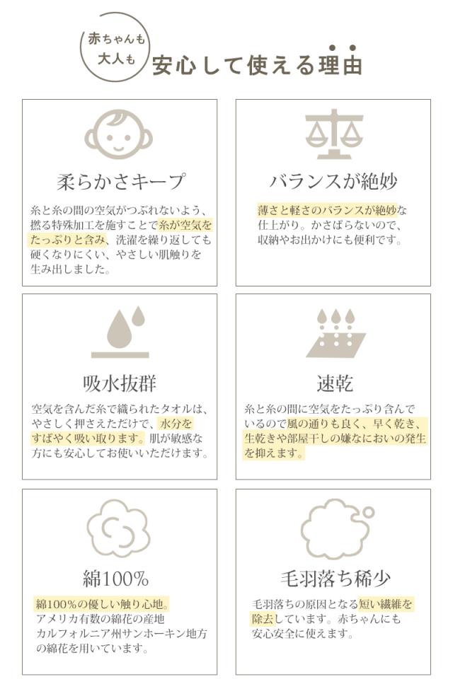 今治タオルならではの、柔らかな肌ざわりと吸水性の高さが魅力です。