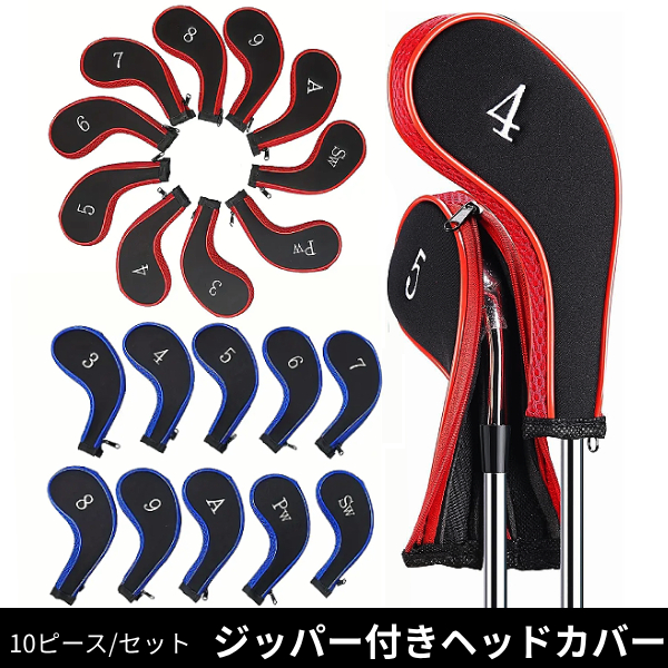 10ピース セット ジッパー付き ゴルフ クラブ カバー ケース 傷防止 アイアン ヘッドカバー パター プロテクター 識別 刺繍 数字 ナンバー