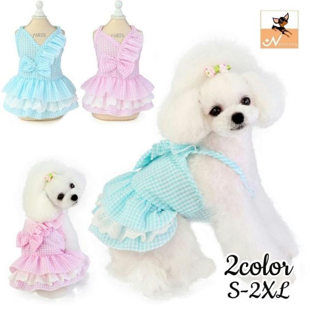 フリル&リボンがかわいいギンガムチェック柄♪ワンピースタイプのペットウェアです。