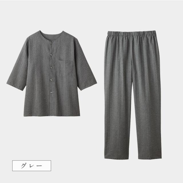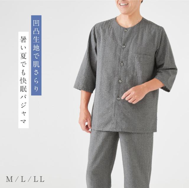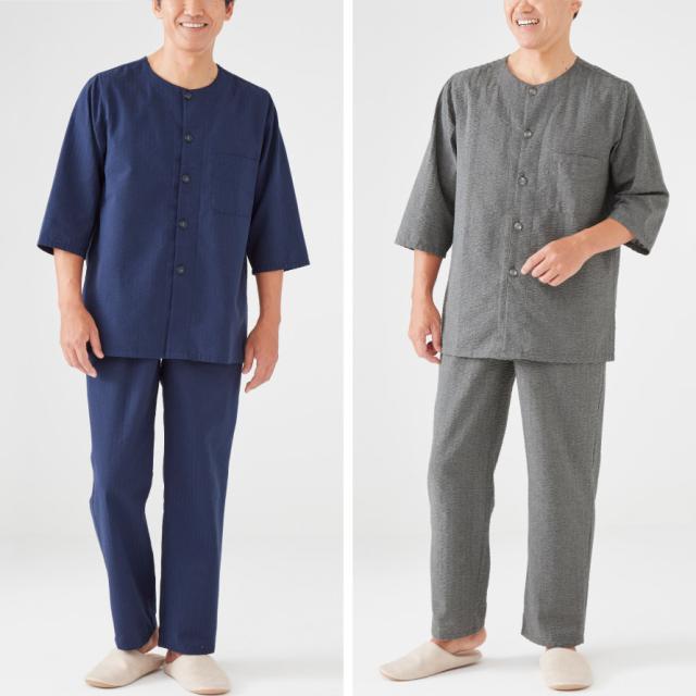 パジャマ メンズ 夏用 7分袖 涼しい メンズ涼快クルーネックパジャマ 誕生日 ギフト シニアパジャマ 高齢者 50代 60代 70代 80代 ルームウェア 上下 七分袖 腰ゴム取替可 ポケット付き 春 夏 半袖 接触冷感 無地 プレゼント M L LL 襟なし 衿なし 紳士用 敬老の日 入院