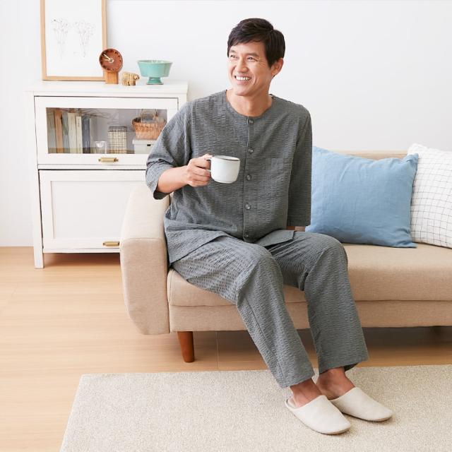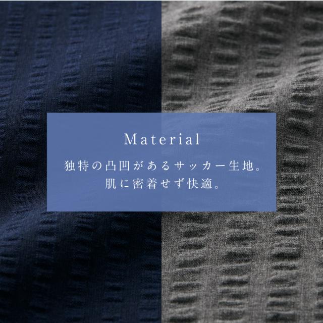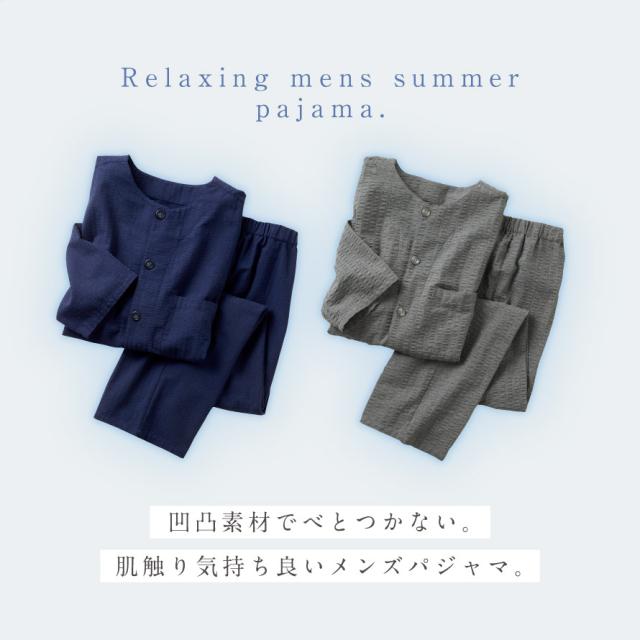 凹凸素材で肌ざわり快適、暑い夏にも安眠のメンズパジャマ。生地の表面は、独特の凸凹があるサッカー生地。経糸(たていと)と緯糸(よこいと)の張り具合の違いによって生まれる凹凸は、肌に生地の表面が密着せず、汗をかいてもベタつきにくくサラっとした着心地。暑い夏でも、心地よく安眠できます。