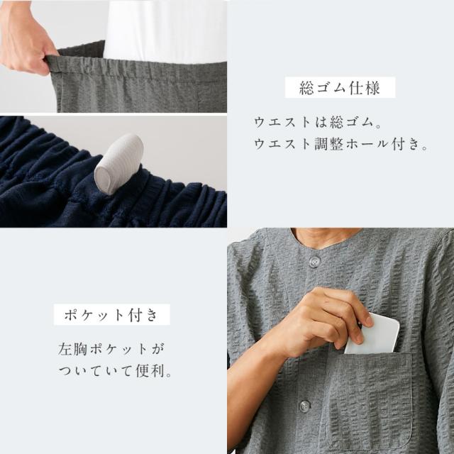 パンツのウエストは総ゴム。お腹まわりが気になる男性にもおすすめの着心地。ゴム調整ホール付きなので、長く愛用していただけます。