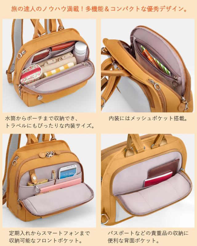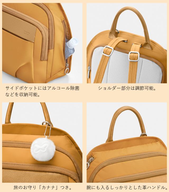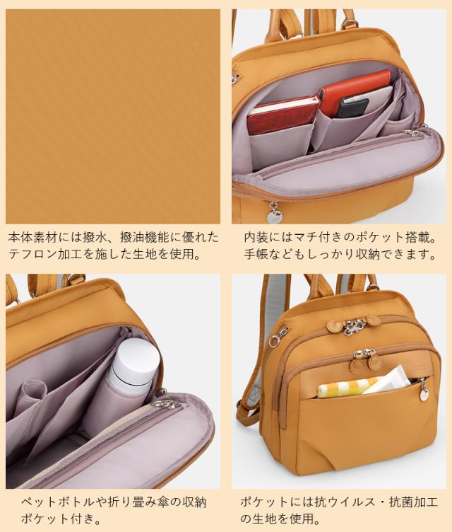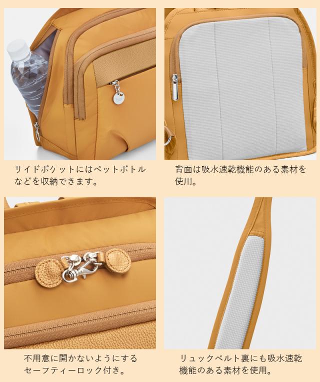シリーズ最軽量。猛暑対策としての背面吸水速乾やバーテクトポケットなど時代の変化に対応し、細部にもこだわり洗練させた定番シリーズのアップデートモデル。大人の女性が街歩きを楽しむ時に持てる「女性が幸せになるリュック」をコンセプトに、背負った時の快適さと美しさにこだわったシリーズ。街歩きに必要な小物が収まる充実したポケットやセキュリティロックがポイント。