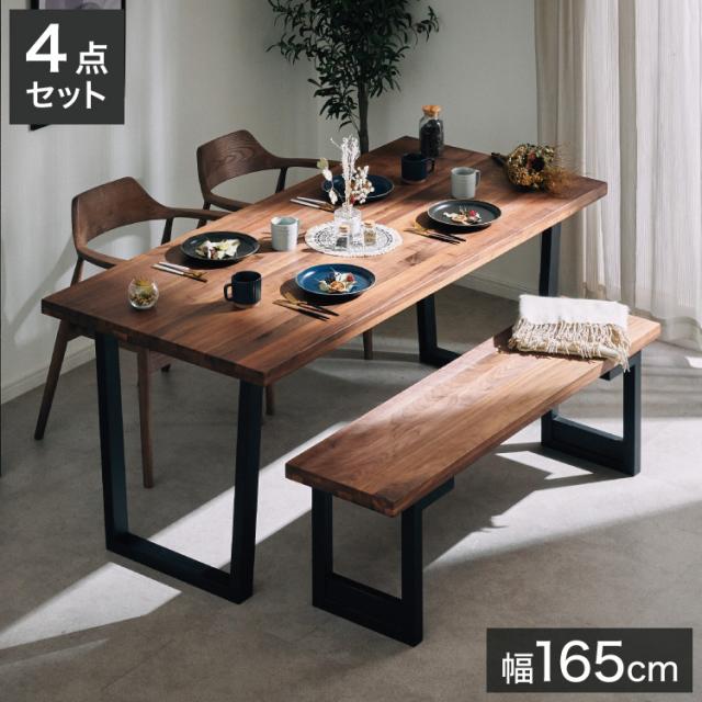 ダイニングセット 4人掛け 4点セット 幅165 ウォールナット無垢材 ベンチ ダイニングテーブルセット 合皮 天然木 ダイニングチェア 食卓 テーブル 椅子 いす(代引不可)【送料無料】