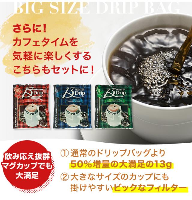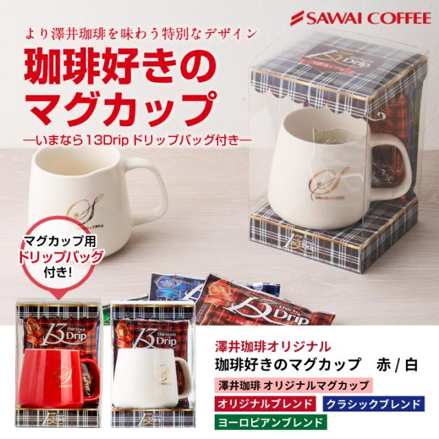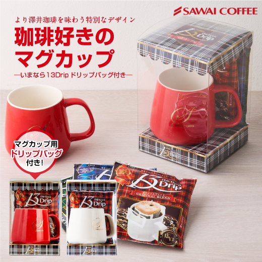 | 内容量 | ●澤井珈琲オリジナルマグカップ 1個(赤または、白) 容量:300ml ●ドリップバッグコーヒー ・13Drip オリジナルブレンド 13g×1袋 ・13Drip クラシックブレンド 13g×1袋 ・13Drip ヨーロピアンブレンド 13g×1袋 |