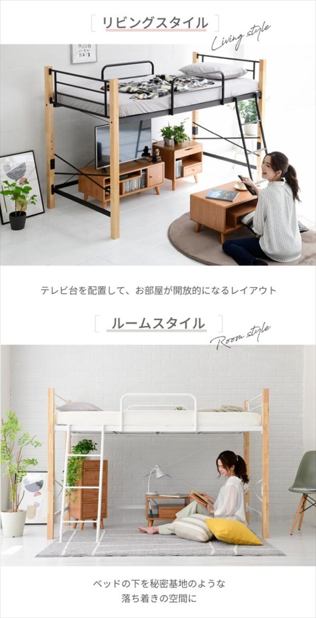 | 温かみのある天然木とクールなスチールのコントラストがおしゃれな、ちょっと低めのロフトベッド。 高すぎないのでどんなお部屋にもおすすめできます。 ベッドの下のスペースは収納に使っても、ロースタイルな生活の一部にしても。 お部屋の雰囲気にあわせて選べる4カラー展開が嬉しい! |