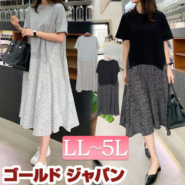 春新作 大きいサイズレディース ワンピース 異素材ドッキングワンピース ワンピ 半袖ワンピース 半袖 膝丈 ミディアム ドッキング 異素材 クルーネック 柄 ダルメシアン柄 ドット ストレッチ フレア 韓国 春服 夏服 LL 2L 3L 4L 5L ブラック 黒 グレー ゴールドジャパン