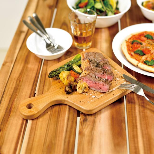 カットボード30cmアイテムです。ナチュラルな質感と竹製ならではのあたたかみが印象的で、いつもの食卓をワンランクアップしてくれます。食器として使用するのも良し、カットボードとしても使用可能なので、ナイフでカットする際も気にせずにお使いいただけます。