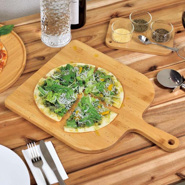 ピザ用プレート31cmアイテムです。ナチュラルな質感と竹製ならではのあたたかみが印象的で、いつもの食卓をワンランクアップしてくれます。お洒落な見た目と使い勝手のよいヘラ型プレートは食器として使用するのも良し、カットボードとしても使用可能なので、ナイフでカットする際も気にせずにお使いいただけます。