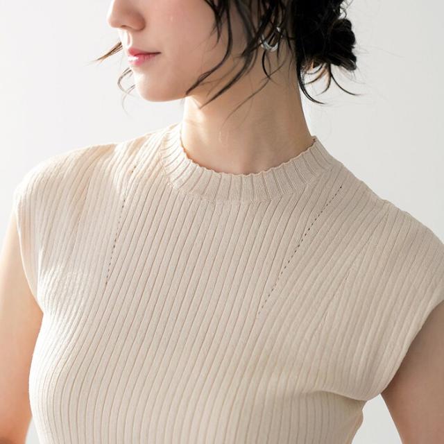 これからの季節に活躍するプチハイネックのフレンチスリーブニット。