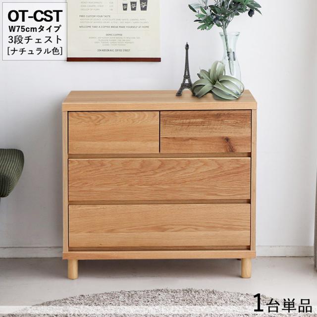 OT-CST 3段チェスト/幅75cm 引出しの収納 タンス【1台単品】ナチュラル色 幅76×奥行40×高さ72cm オーク無垢材 スライドレール仕様 リビング収納