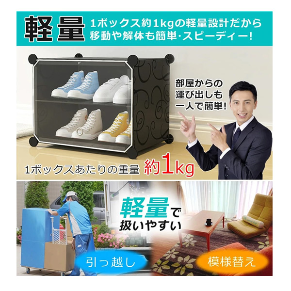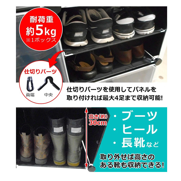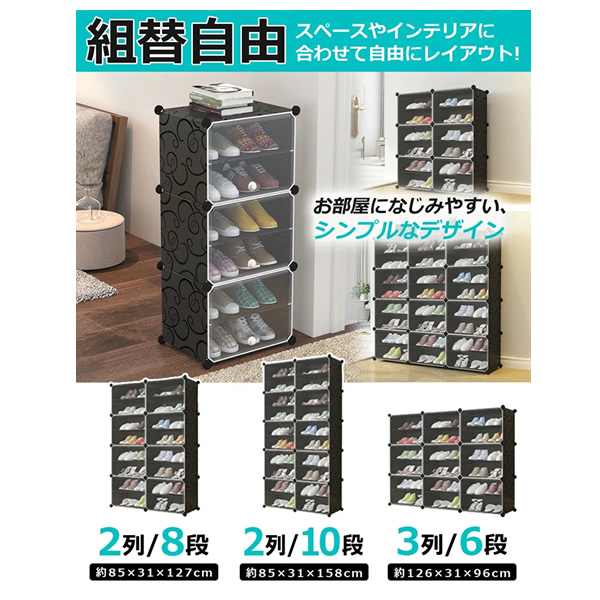 自由に組み換えできる。組み立て式シューズボックス ■製品サイズ:約 W126×D31×H127cm ■製品重量:約12.1kg ■耐荷重(1ボックスあたり):約5kg ■材質:PP樹脂、ABS、鉄 ※記載は商品仕様の一部です。仕様説明不足等の理由での返品はできません。特に適合等は必ずご確認ください。
