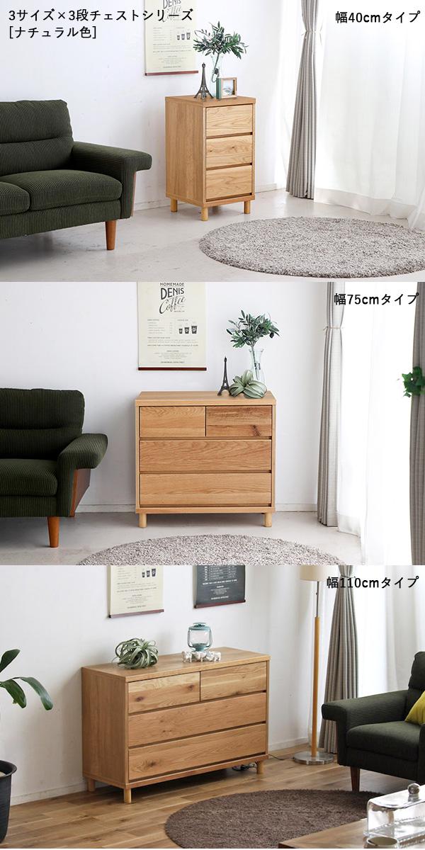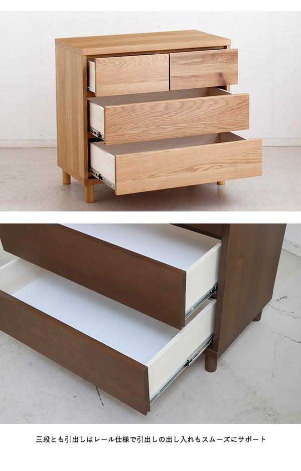 OT-CST 3段チェスト/幅75cm 引出しの収納 タンス【2台セット】ナチュラル色 幅76×奥行40×高さ72cm オーク無垢材 スライドレール仕様 リビング収納