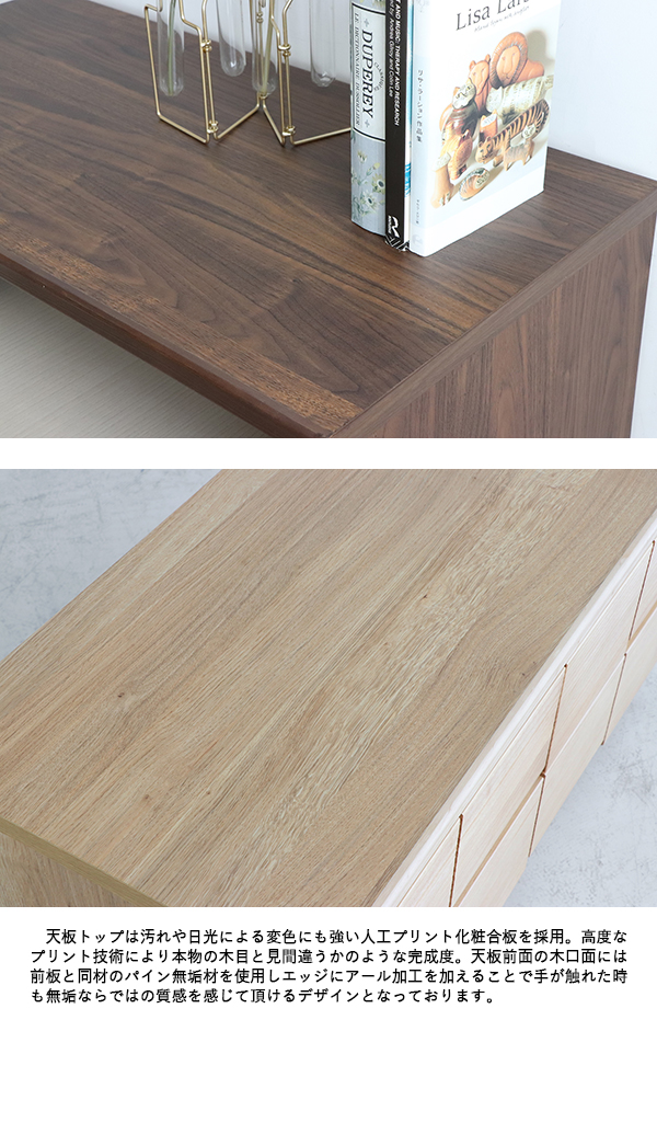高度なプリント技術により本物の木目と見間違うかのような完成度。天板前面の木口面には前板と同材のパイン無垢材を使用しエッジにアール加工を加えることで手が触れた時も無垢ならではの質感を感じて頂けるデザインとなっております。
