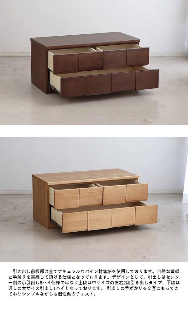 引き出し前板部は全てナチュラルなパイン材無垢を使用しております。自然な質感と手触りを実感して頂ける仕様となっております。デザインとして、引出しはセンター割の小引出し8ハイ仕様ではなく全段中サイズの全4段引き出しタイプとなっております。引出しの手がかりを交互にもってきておりシンプルながらも個性派のチェスト。