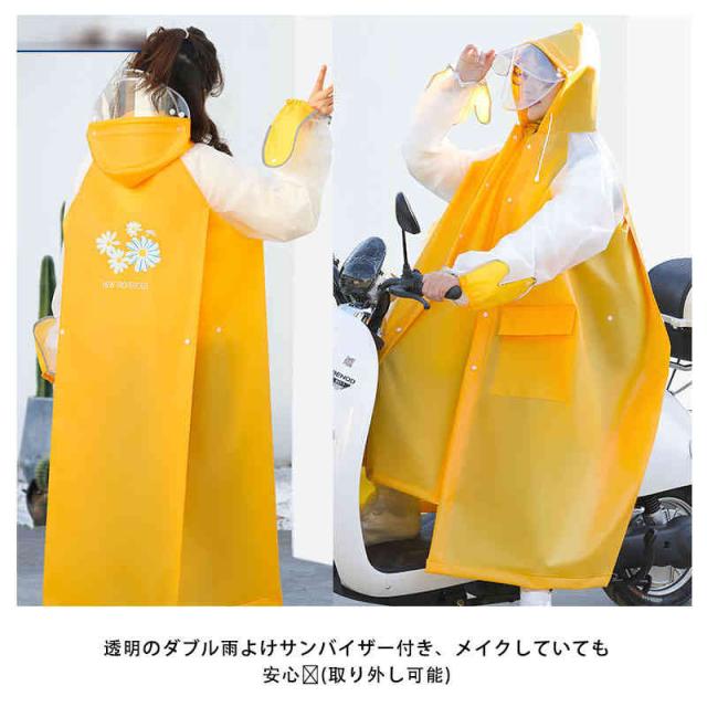| 自転車でも濡れにくい!ふんわりポンチョ型のレインコートなのでリュックを背負ったままOK! 透明のダブル雨よけサンバイザー付き、メイクしていても安心♪(取り外し可能) 防風手袋付き♪ 高い防水性&撥水力!耐久性が高い、しっかりとハリ感のある生地です。 | |