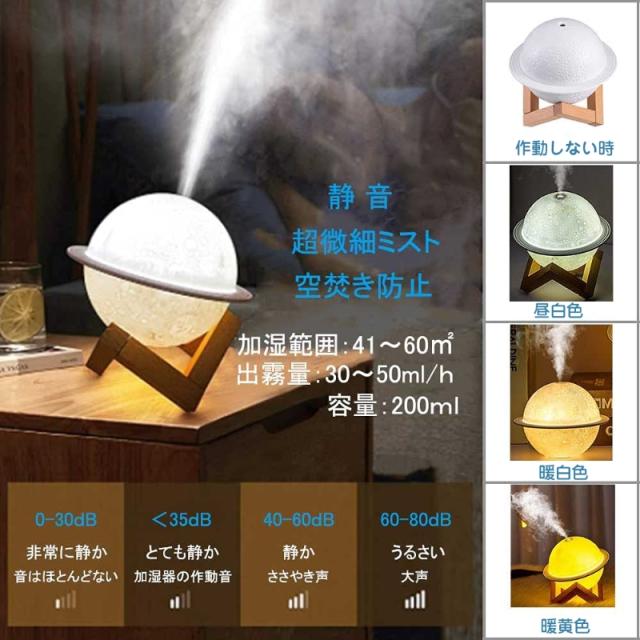【ミニ超音波加湿器&空焚き防止&USB給電式】加湿範囲:41〜60m2、出霧量:30〜50ml/h、容量:200ml、連続使用時間:4時間、間欠使用時間:8時間。創意惑星ランプ超音波加湿器は振動で水を微細なミストに分解して放出し、超微細ミストの潤いをお届けします。霧化ピースの電子を通して高周波数振動して、液体水分子の構造をバラバラにして安心超微細な霧状ミストを生成し、乾燥対策は一番おすすめです。霧化する時大量のマイナスイオンを放射して、静電気を防ぎ、また、フォルムアルデヒド、一酸化炭素、細菌など有害物質を取り除く可能です。(★ご注意:これはusb給電式の加湿器、充電式加湿器ではありません。)