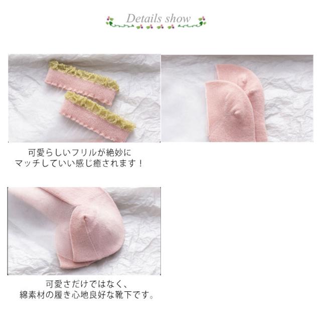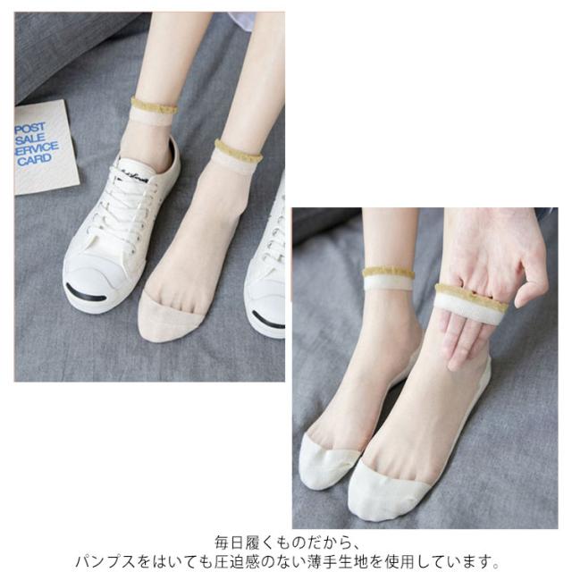 | カラーバリエーションのおしゃれなシアーソックス。 暑い日でも足元をおしゃれに涼しげな印象にみせてくれます。 シースルーーで履いた感も見た目も涼しい! 可愛らしいフリルが絶妙にマッチしていい感じ癒されます! 可愛さだけではなく、綿素材の履き心地良好な靴下です。 毎日履くものだから、パンプスをはいても圧迫感のない薄手生地を使用しています。 伸縮性と吸収性は優れ、まとめ買いやプレゼントにもオススメ、お洋服やその日の気分に合わせやすい! | |