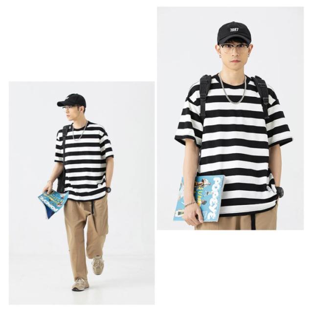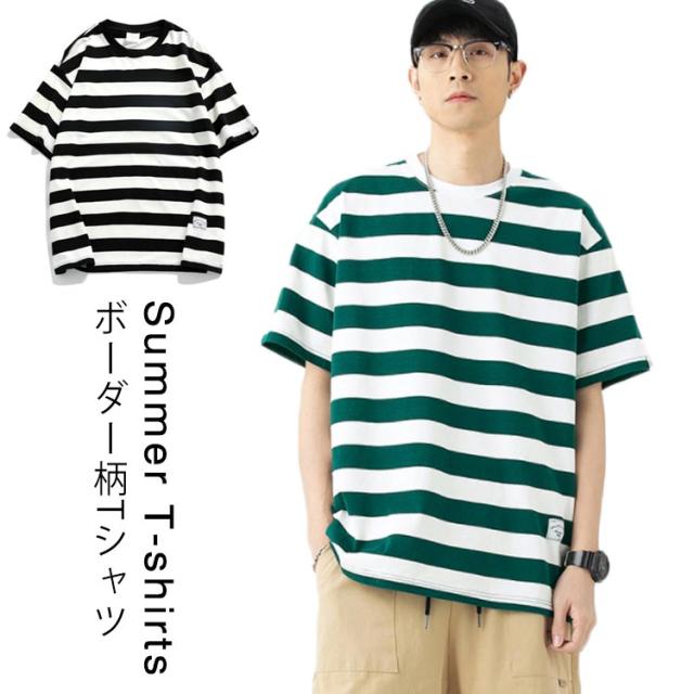 ボーダー 半袖 Tシャツ クールネック Tシャツ ゆったり 男女兼用 Tシャツ ボーダー柄 Tシャツ コットン Tシャツ 半袖Tシャツ メンズ レディース 体型カバー ストリート風 夏 Uネック トップス ペアルック カットソー 爽やか 夏男 春 夏 夏服 送料無料