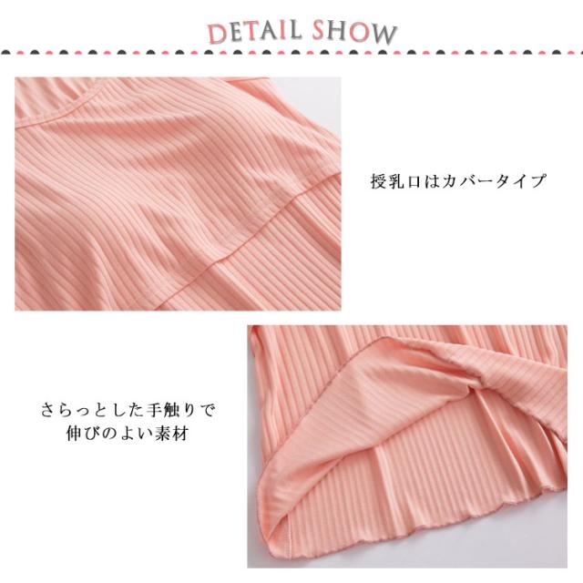 | さらっとした手触りで伸びのよい素材です。 厚すぎず、薄手すぎず、しっかりした素材です。 授乳口はカバータイプで身ごろが二重構造になっています。 上布をめくって授乳することができます。 しっかりとしたフィット感がポイント。 | |