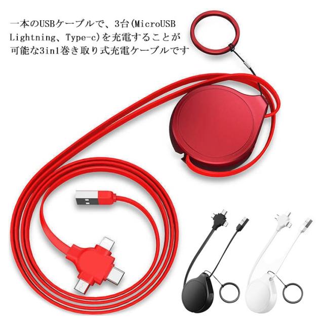 3in1 iOS / Micro USB / USB Type-C 巻き取り ホルダー ケーブルライトニングケーブル 携帯便利 microusb typec スマホ 充電ケーブル iPhone Android Xperia AQUOS