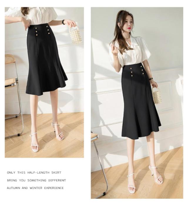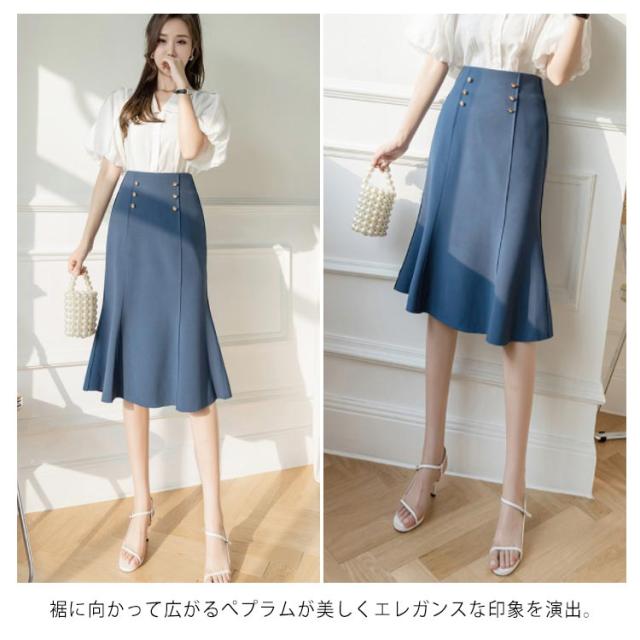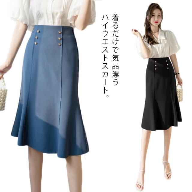ハイウエストスカート 膝丈スカート マーメイドスカート 送料無料 マーメイド タイトスカート スカート フリルスカート 通勤スカート フリル ハイウエスト 春夏 秋 美ライン ブラック ブルー 大人 エレガント