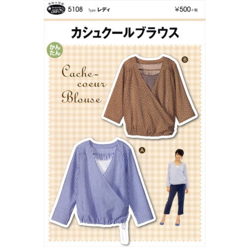 裾に通したリボンやゴムで調節ができるカシュクールタイプのプルオンブラウス。