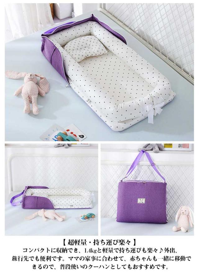 | 【 赤ちゃんもママも安心 】ママのお腹の中にいるような感覚を再現、赤ちゃんに安心感を与え、快適な眠りをサポートします。赤ちゃんを包み込む仕様で、添い寝の時も安心。パパ、ママが寝返りを打っても安全です。 【 高品質なクッション 】高品質で程良い弾力性のあるクッション。 人体工学に基づいた設計で、枕も付属しており赤ちゃんも心地よく寝れます。 【 おむつ替え簡単・ベッドシートも付属 】リボン部分を解けば簡単におむつ替えが可能です。通気性に優れたベッドシートも付属で、赤ちゃんの寝汗もしっかり吸収します。 【 超軽量・持ち運び楽々 】コンパクトに収納でき、1.4kgと軽量で持ち運びも楽々♪外出、旅行先でも便利です。ママの家事に合わせて、赤ちゃんも一緒に移動できるので、普段使いのクーハンとしてもおすすめです。 【 お手入れ簡単・お洗濯もOK 】ふとんカバーや中身のクッションは取り外して洗濯が可能です。いつも清潔にお使いいただけます。 | |