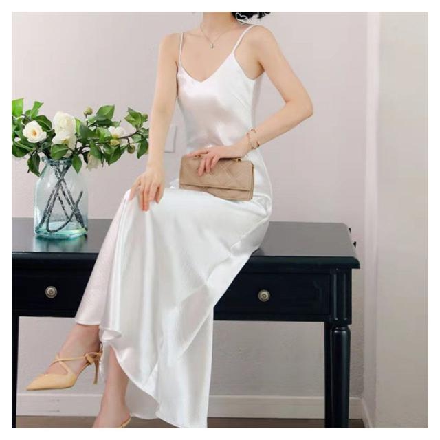 | 韓国デザインのサテンロング丈ワンピース。 Vネックに華奢な肩紐のキャミソールワンピース。 光沢感のある上品なサテン素材でひらひらとエレガント。 春にはレースインナーとコーデして、様々なコーディネートに使えるアイテムです。 | |